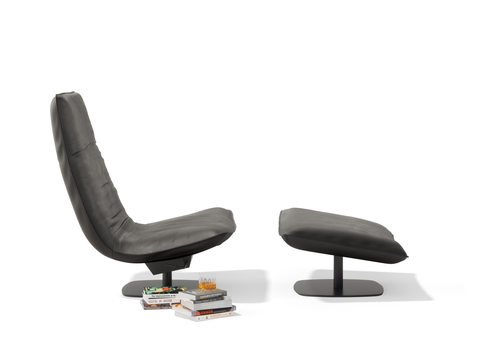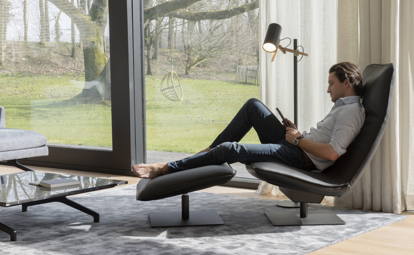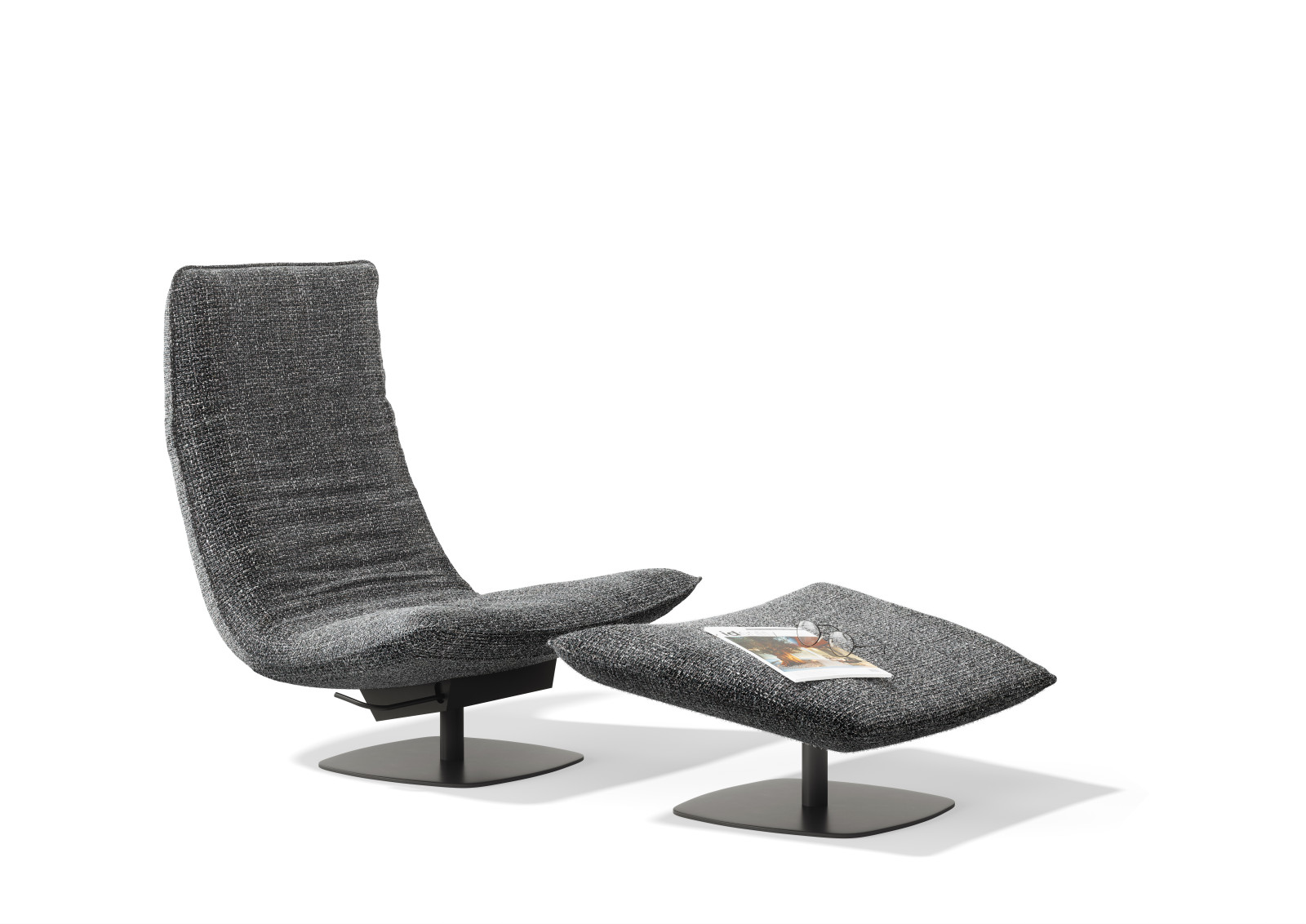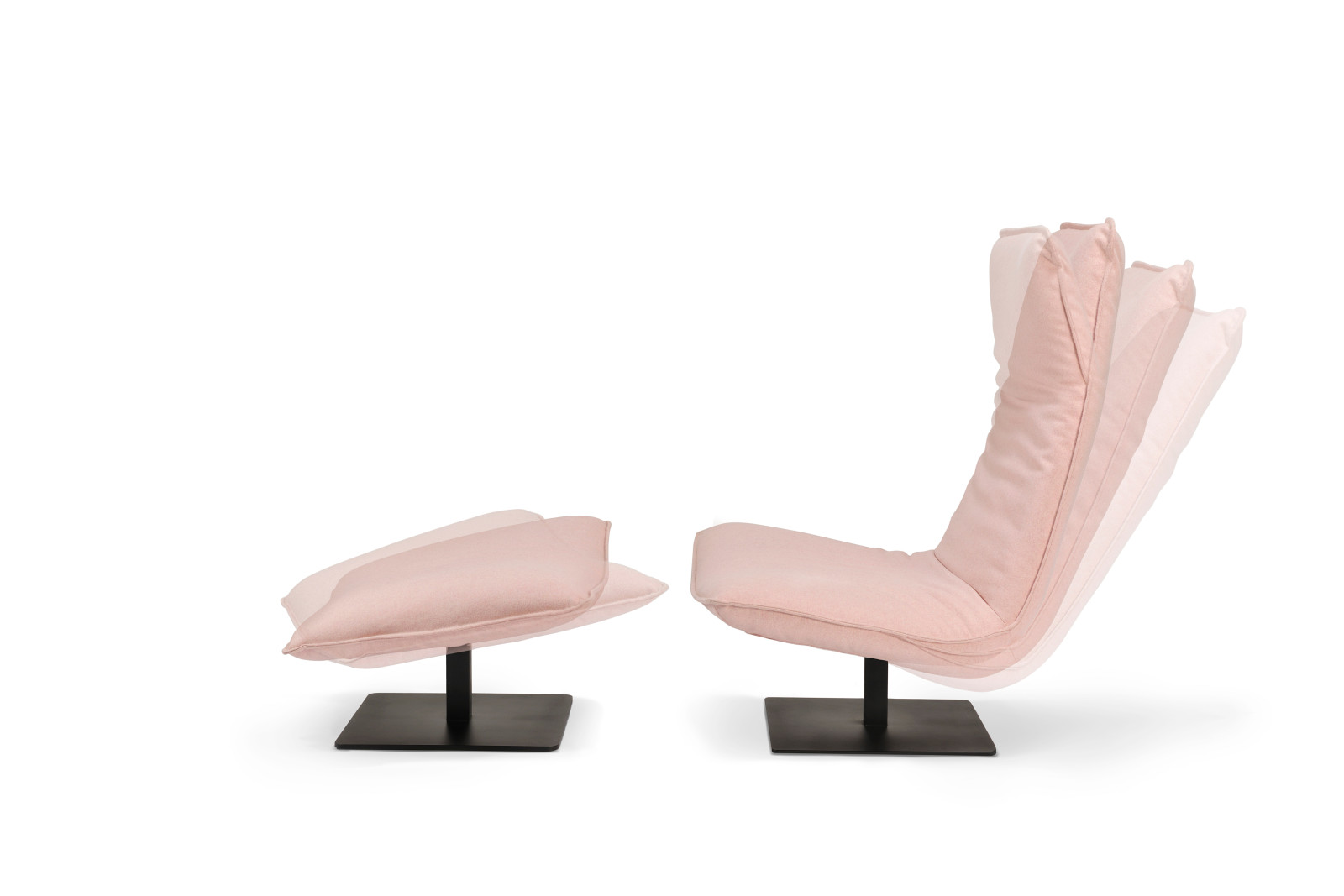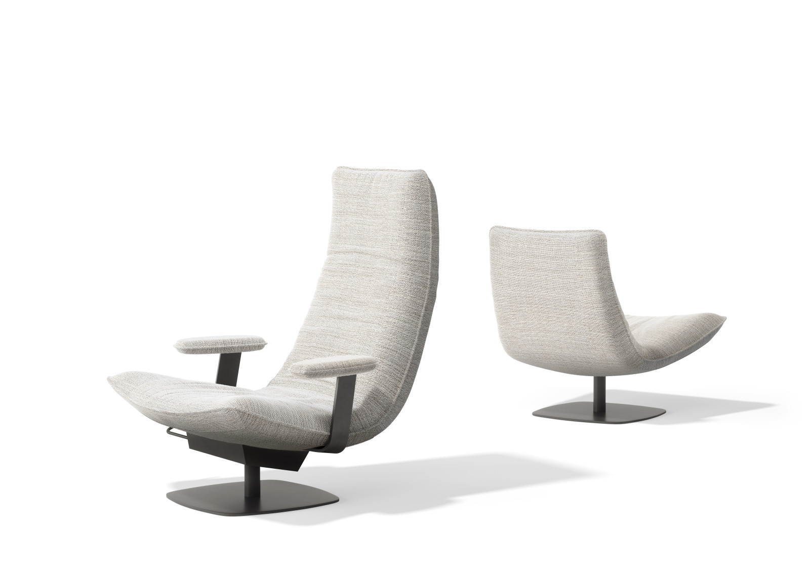 Le Sac is entirely on your terms. Choose between two heights (high or low) and two widths, with or without optional armrests. The chair rotates 360° around its axis, together with the matching ottoman. An integrated lever moves the backrest silently and smoothly into your desired position; the neckrest follows with a simple fold. This way you always find your ideal posture — sitting upright to read, half-reclined to watch TV, or fully stretched out to simply be. Le Sac guarantees hours of relaxation, without compromise.
